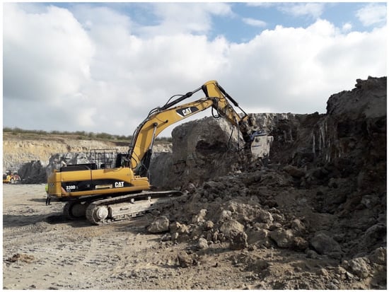 Where restrictions exist due to proximity to, e.g., housing structures or other constructions, quarry mining operations employ mechanical equipment, such as crawler tractors or bulldozers with ripper arms, excavators equipped with hydraulic breakers and vibration ripper devices, or continuous surface miners [15]. Compared to drilling and blasting, mechanical excavation is considered to be more expensive and time-consuming, with its main environmental impact associated with the production of fumes from diesel engines or near-distance emission of noise and dust [16,17,18]. The production rate of mechanical extraction in quarries depends on the type of machine used, its size, the mining and geological conditions, and the skills of the operators, based on which it varies from 10 to 500 Mg·h−1 [19,20,21]. The most common heavy equipment used in quarries is powered by diesel combustion engines, which are estimated to be 35–45% energy efficient [22,23,24,25].