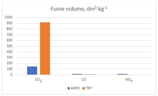 Fumes (COx and NOx) were quantified in accordance with the standard [37], which adheres to directive [38]. ANFO charges, each weighing 500 g, were detonated within a steel mortar situated in the blasting chamber. Following detonation, the resulting fumes were homogenized for 3 min using a mixing procedure. Subsequently, gasses were collected for 20 min via the ventilation system. The concentrations of COx and NOx were determined using IR (MIR 25e, ENVEA, Paris, France) and chemiluminescent (TOPAZE 32M, ENVEA, Paris, France) analyzers, respectively. The concentrations of carbon monoxide (CO) and nitrogen oxides (NOx) in the gaseous products were measured and reported per kilogram of explosive used.