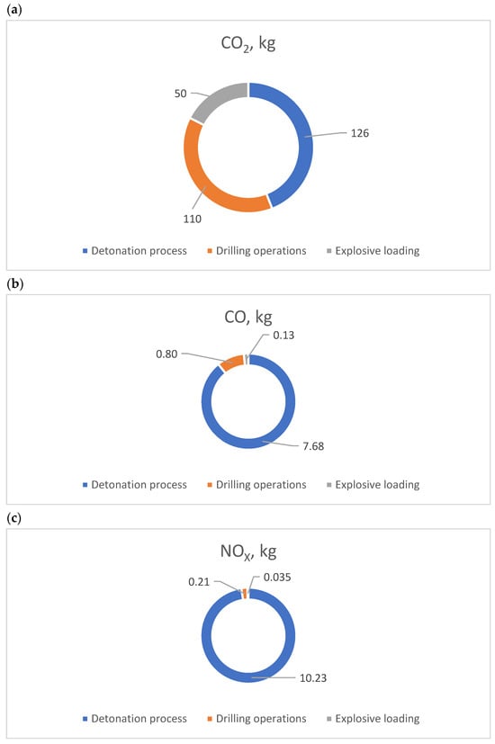 Mineral extraction in open-pit mining is mostly related to the application of the blasting technique and mechanical extraction; however, drilling and blasting are considered the primary methods for quarrying rock mass due to their cost-effectiveness and ability to produce large volumes of well-fragmented rock in a relatively short period. This method is predominantly used for mining deposits of rock raw materials with compressive strengths above 20 MPa [1]. However, during the detonation process, explosive charges in boreholes generate a significant amount of energy, and, through the impact of the shock wave, stress waves, and expansion of the gaseous reaction products on the rock mass, they fracture the rock mass and release energy into the environment [2]. The literature shows that only 20–30% of the detonation energy is used for fragmentation, with the remaining energy being dispersed into the environment in the form of blast-induced vibrations, airborne shockwaves, and fly rock [3,4,5,6]. In sites where housing structures are close to open-pit mines, these environmental impacts can significantly restrict or even prohibit the use of blasting techniques [7,8,9,10,11,12]. Aside from the environmental risks associated with the release of detonation energy into the environment, the main gaseous products of decomposition reactions are large quantities of carbon and nitrogen oxides, which are considered fumes [13,14].
