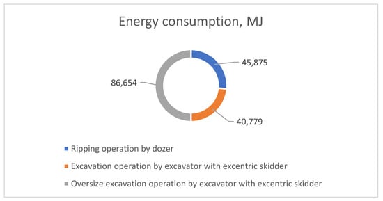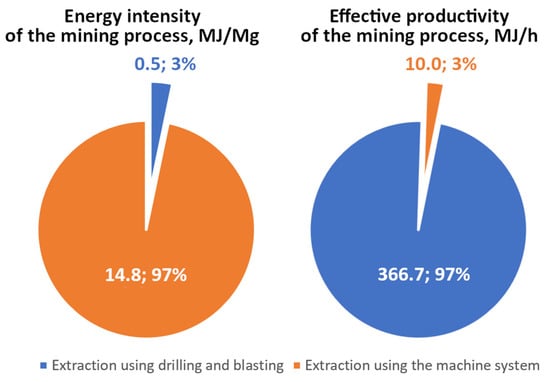 The energy consumption analysis indicated that mechanical extraction with a combination of a crawler excavator and a crawler bulldozer required much more energy (86,654.15 MJ) compared to blasting techniques. In the case of blasting techniques, energy consumption ranged from 1298.12 to 1462.22 MJ. This range depended on the effective utilization of the detonation energy for quarrying. Moreover, approximately 970 MJ of energy was obtained from the detonation process. The residual energy was derived from diesel combustion in explosive loading and drilling operations. The energy from diesel combustion in both mining systems dissipated over a long period of time, resulting in the dilution of fumes. Based on the obtained data, it was established that the extraction of 12,779 tons required, depending on the extraction system, approximately 7.46 h (blasting techniques) or 130.6 h (mechanical excavation). This reveals that, in terms of operation time, the blasting technique is much more efficient. The analysis showed that, while blasting is more energy-efficient in terms of energy used per unit of extracted material, the mechanical excavation efficiency may decrease over time due to equipment wear and tear. This decline in efficiency can impact the overall productivity of the mining process.