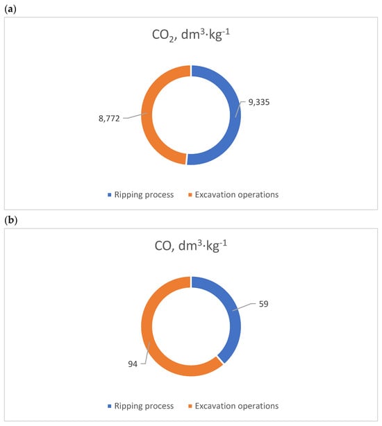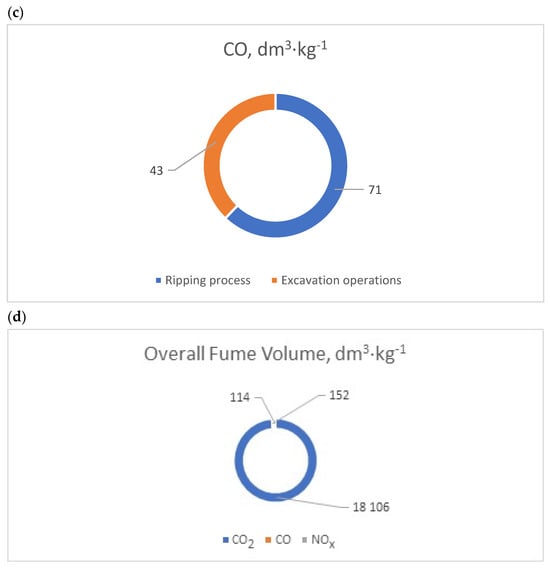 The fume analysis indicated that, in terms of blasting operations, the CO and NOx are mostly generated by the explosive’s detonation. The CO2 is mostly derived from the combustion of diesel. However, the composition of the fumes may be influenced by the type of explosives that are used. In terms of mechanical extraction, the overall emission of fumes was 18,106.28 kg of CO2, 152.34 kg of CO, and 114.32 kg of NO.