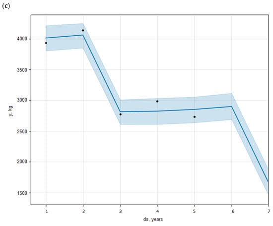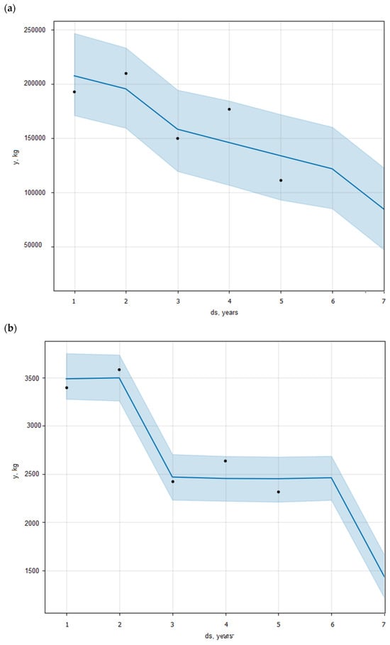 The FBProphet algorithm is an additive regression model featuring either a piecewise linear or logistic growth trend. This model incorporates a yearly seasonal component, represented via Fourier series, and a weekly seasonal component, modeled using dummy variables. Due to the limited dataset provided by the open-pit mine authorities, a full seasonal analysis was not included in the manuscript. Generally, the Prophet model is well-suited for datasets that encompass extended time periods (months or years), exhibit multiple strong seasonality, include known significant yet irregular events, contain missing data points or significant outliers, or show non-linear growth trends approaching a limiting value. The algorithm was employed for modeling time series data as a combination of trend, seasonality, and noise components, utilizing Bayesian inference. It applied a decomposable time series model described by Harvey and Peters [41,42], according to Equation (5) [43]: