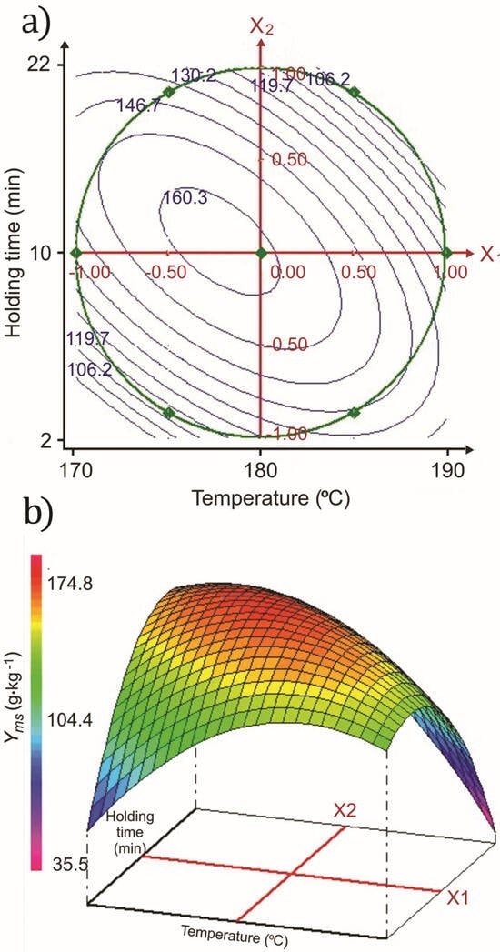 The hydrothermolysis of the hemicellulose and the partial hydrothermolysis of the cellulose present in the WLS into monosaccharides was most efficient at temperatures ranging from 174.6 °C to 181.1 °C, with th between 7.3 min (t = 9.4 min) and 14.1 min (t = 16.0 min) (Figure 1a). The predicted optimal yield of monosaccharides (Yms) was 162.5 g·kg−1 ± 5.2 g·kg−1, which occurred at T of 177.4 °C and a th of 10.8 min (t = 11.6 min). This was in close agreement with the experimental results, with a coefficient of determination (R2) of 0.942, indicating a strong correlation between the model and the observed data.