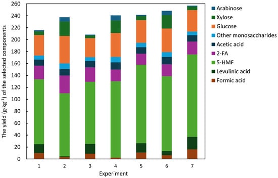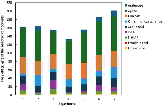 The yield (g·kg−1) of the selected components contained in the WS fractions obtained from the hydrothermolysis of WLS in experimental series 1. Experiment 7: mean values for three repeated experiments. Other monosaccharides: the sum of rhamnose, galactose and mannose.