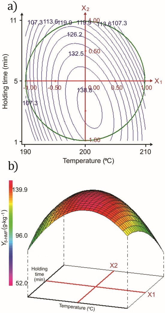 In the experimental series focused on optimizing 5-HMF production, the standard error for the coefficients was as follows: for b0, b1, and b2, it was 0.38; for b11 and b22, it was 0.6; and for b12, it was 0.76. The two-dimensional (a) and three-dimensional (b) representations of the 5-HMF yield (Y5-HMF) in the WS fractions, as a function of the reaction temperature and holding time, were calculated using these models and are shown in Figure 3. The contour plots in Figure 3a represent constant value curves for Y5-HMF, as predicted by the quadratic model.