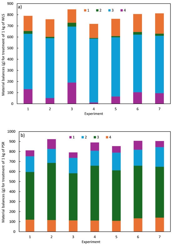 (a) Material balances for hydrothermal treatment of 1.0 kg of WLS (experimental series 1). (b) Material balances for hydrothermal treatment of 1.0 kg of PSR (experimental series 2). Experiment 7: mean values for three repeated experiments. 1. WS product fraction including primary products: monosaccharides and acetic acid. 2. WS product fraction including secondary products: 2-FA, 5-HMF, formic acid and levulinic acid. 3. WI product fractions. 4. Losses and gas fraction (losses in all received product fractions were calculated according to equation losses = 1 kg minus mass of WS fraction minus mass of WI fraction).