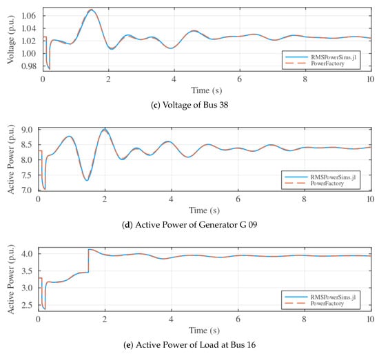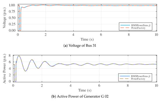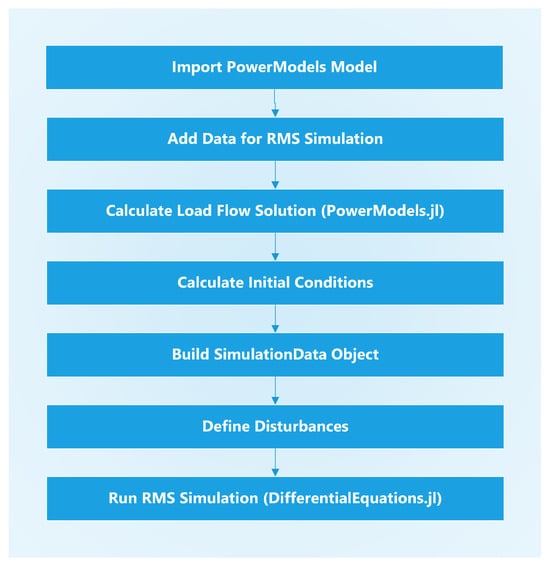 The PowerModels.jl package provides a power system modeling framework, with the aim of facilitating the easy comparison of OPF formulations and is the only Julia package known to the authors capable of solving AC OPF problems. Substantial work has been performed in implementing large, synthetic models of Australia’s National Electricity Market in the PowerModels.jl format, and it would be beneficial to be able to build on these models for dynamic simulation; however, this functionality is not supported by PowerModels.jl [,]. It is possible to convert from the PowerModels.jl network data dictionary (NDD) format to a format which can be used with software, either commercial or open-source, that is capable of dynamic simulation. In particular, the ability to import and export steady-state network models in the MATPOWER case file format [] is commonly supported by open-source power system simulation packages. However, in the experience of the authors, the process of implementing a power system in multiple software programs is time consuming, requires verification to ensure that the models are equivalent, requires maintaining two separate representations of the same system, and often requires an in-depth knowledge of both the source and destination program/format. It is, therefore, preferable to build on an existing model rather than reconstructing it in a different format. For this reason, this paper presents the development of a Julia-based simulation package, known as RMSPowerSims.jl, that is capable of performing dynamic simulations using the existing PowerModels.jl model package from Julia.