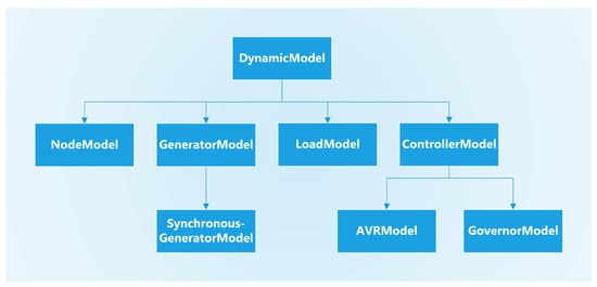 where u is a state vector containing the state and algebraic variables of the system, is a vector containing the derivatives of the state variables, p is an object containing the non-time-varying parameters of the system, t is the time, and is a vector containing the residuals of the differential and algebraic equations. The body of code in the is where the equations that define an arbitrary dynamical system are implemented. Since a power system is an example of a DAE-type system, it is possible to directly implement the equations that define the system in this form. However, due to the size and complexity of modern power systems, it is more practical to define the equations in a modular form, with each component of the system representing a functional module that has its own parameters and equations. These function modules can then all be called from a single main function that assembles the equations of the entire system. Algorithm 1 shows a pseudo-code representation of how this process is implemented in RMSPowerSims.jl, where , , and are the subsets of the u, , and vectors that are necessary for the implementation of the component model, and is a custom typed object that contains the parameters of the component model. This custom typing is important, as it allows for the use of Julia’s type-based multiple dispatch capabilities. Multiple dispatch in Julia allows for the definition of multiple methods for a given function, with the method that is called being determined by the types of the arguments passed to the function []. In the context of RMSPowerSims.jl, this allows the solver to identify which moduar should be applied, depending on the type of the parameter. This type is defined within a hierarchical typing structure, with the supertype defined as ComponentModel. The type hierarchy and the existing sub-types defined are discussed further in Section 2.2.