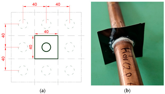 To carry out the measurements, standard 5/8″ nominal diameter Cu-DHP copper tubes of 25 cm length were manufactured from tubes supplied by CAADEX (Mindszentgodisa, Hungary), with a lamella placed in the middle. The connection between the lamella and the tube was made using various contact materials and manufacturing techniques (gluing, soldering, etc.). Two types of lamellae were supplied by CAADEX, both of the Al 8006 alloy, the difference being that one was an uncoated aluminum lamella, and the other was the same type of lamella but coated.