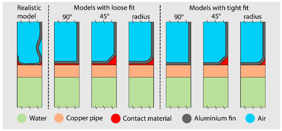 In this study, one of the primary tools utilized is finite element analysis (FEA), a critical computational technique within the field of engineering. FEA is employed to simulate and analyze intricate structures by discretizing them into smaller, finite elements, thereby enabling detailed examination of their behavior under various conditions. This technique solves partial differential equations governing phenomena such as stress distribution and heat transfer. FEA has become indispensable for predicting the performance and reliability of complex systems in engineering and is thus widely used in the research of heat exchangers [15,16,17,18,19]. The modeling of heat exchangers poses some widely known meshing difficulties [20], which come from the dimension difference of the thin lamellae and other volumes. Thus, another aim of this research is to establish some guidelines for modeling the fin–tube contact region of heat exchangers for a specified purpose.