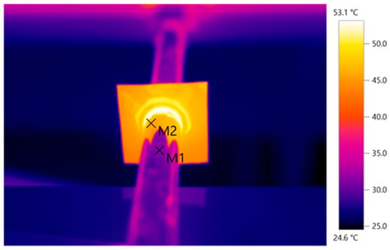 By using contact materials, heat transfer may be improved, in which case the fin temperature would increase; thus, a thermographic measurement is used. The instrument used was a Testo 882 thermal imaging camera (Testo Inc., Sparta, NJ, USA). The camera’s sensitivity does not determine the accuracy of the temperature measurement, as it is determined by the emissivity factor of the inspected surface in addition to the measurement accuracy of the thermal camera. We can usually determine the emissivity with a lower accuracy.