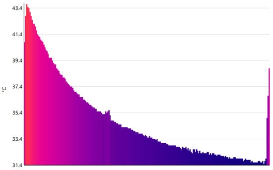 To interpret this in the thermal image, a small hole was made in the fin at the start and end points of the line, and a control point was placed between them. This ensures that the line can be placed in the same location for each measurement when processing the thermal image. A histogram is created with the acquired measurement data (Figure 10).