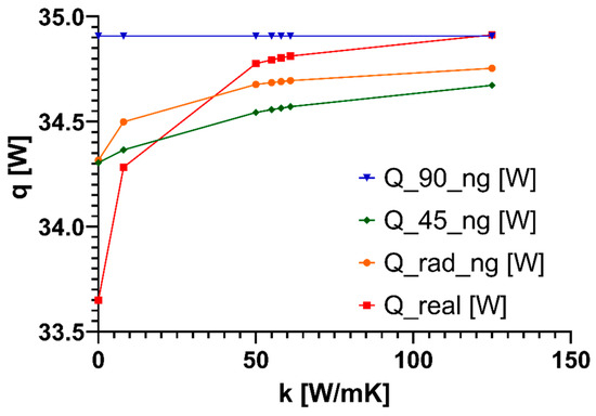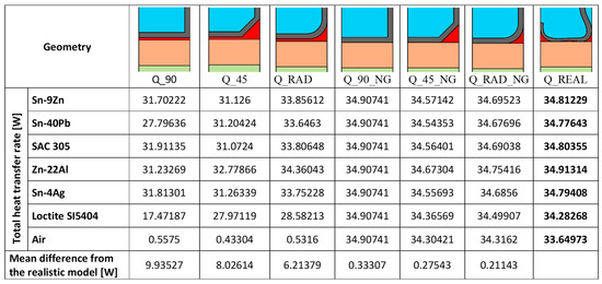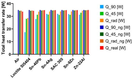 The total heat transfer rate results of the finite element analysis can be seen in Figure 11 for each model type and the realistic model. The results show the values for each inspected contact material and the absence of any contact material using an air gap.