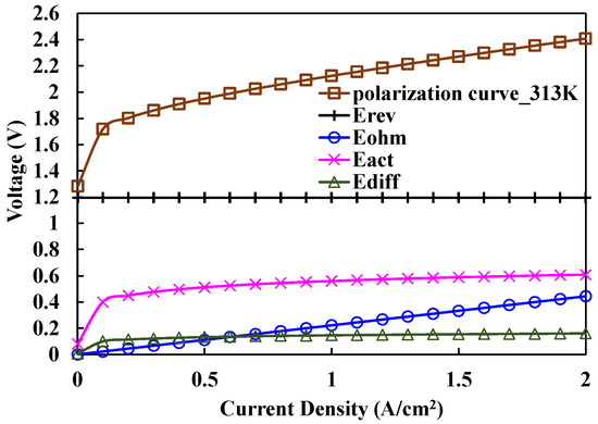 The present study analyzes the electrochemical and mechanical phenomena of the AEM water electrolysis system by modeling key components such as the electrolyzer, heater, electrolyte pump, and hydrogen compressor. Figure 2 shows the reversible potential of an AEM water electrolysis cell and the effects of activation, ohmic, and concentration polarizations on the current density of the AEM cell. It shows that in a low current density zone, less than 100 mA/cm2, the activation and concentration polarizations dominate and construct a barrier to hydrogen production. In the high current density zone, the gradients of activation and concentration polarizations gradually reduce.
