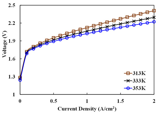 The temperature effects on the polarization phenomena are shown in Figure 3 and Figure 4. In this study, the phenomena at operating temperatures of 313 K, 333 K, and 353 K are studied with a hydrogen production pressure of 1 bar and electrolyte concentration of 8 M. Considering the stability of the anion exchange membrane, higher operating temperatures are not adopted. The results show that high temperatures would increase the energy barriers that must be overcome in activation polarization and concentration diffusion, but at the same time, significantly reduce the electrolytic resistance. As shown in Figure 3, temperature effects on the polarization overpotential within the cell demonstrate that temperature primarily influences activation polarization by affecting the limiting current density, thereby altering the overpotential, as described in Equation (6). Observing Equation (6) reveals that the impact of temperature on activation overpotential remains minimal, which is reflected in Figure 3a, where activation polarization shows no significant overpotential changes with temperature variation. In contrast, Figure 3b illustrates that ohmic polarization varies considerably with temperature; higher temperatures result in a reduction in overpotential caused by ohmic polarization. Equations (9)–(13) indicate that temperature effects enhance the conductivity of the KOH electrolyte and the membrane material. Increasing temperature promotes conductivity, enhancing internal conductivity within the cell, and improving performance. This analysis suggests that temperature effects in AEM water electrolysis primarily reduce ohmic overpotential by enhancing the conductivity of both the membrane material and electrolyte.