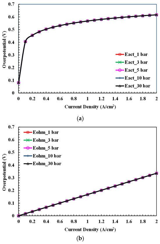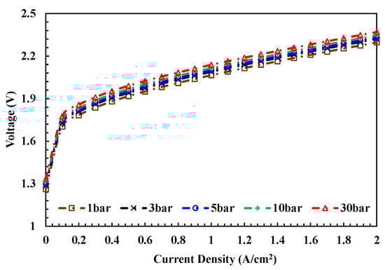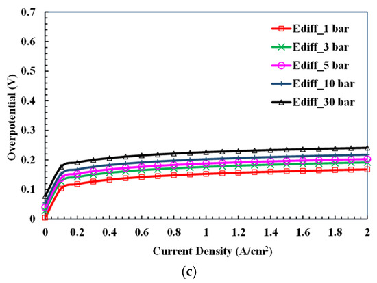 Figure 5 and Figure 6 show the pressure effects on the polarization phenomena with a hydrogen production pressure of 1, 3, 5, 10, and 30 bar. The electrolyzer temperature is 333 K and electrolyte concentration adopts 8 M. Since the activation and ohmic polarization are material-behavior-dependent, the variation in hydrogen production pressure with relation to transport phenomena mainly affects the concentration polarization. As the results in Figure 5c display, the increment from 1 bar to 30 bar is about 0.07~0.08 V/cell as the current density exceeds 100 mA/cm2. It is noted that the effects of hydrogen production pressure on the polarization phenomena are consistent at high-current operation, while the effects of temperature are current-density-dependent, as shown in Figure 4.