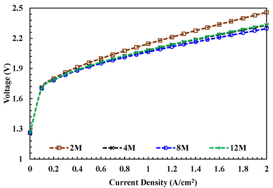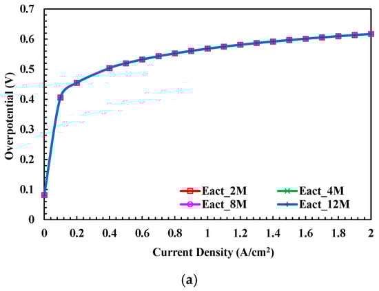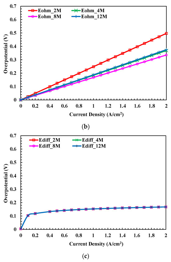 The concentration of the electrolyte is an important factor affecting the polarization phenomena of the AEM cell as well as temperature and hydrogen pressure. Gilliam et al. [19] reported that the specific conductivity increases with electrolyte concentration and achieves a maximum value under different operating environments. Figure 7 and Figure 8 show the simulation results of the AEM electrolyzer operating as 333 K and 1 bar of hydrogen pressure with different electrolytes of 2 M, 4 M, 8 M, and 12 M concentrations. Obvious overpotential differences are found in the ohm polarization curves, in which the case of 8 M has the best performance. The results are consistent with Gilliam et al.’s work [19].