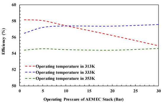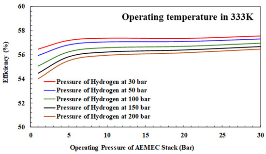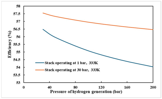 In addition to on site hydrogen production and application, hydrogen can be stored at a pressure of up to 200 bar and transported to users. The simulation results in Figure 10 show that the phenomenon is consistent with pressurizing it to 30 bar but the overall efficiency decreases slightly because of the increase in compressor power consumption. It is noted that increasing the hydrogen production pressure of the electrolyzer has a positive impact on the energy efficiency of the overall hydrogen supply. The greater the demand for hydrogen pressure, the more significant this effect will be. Taking the electrolyzer operating temperature of 333 K as an example, Figure 10 shows that when the demand hydrogen delivery pressure is 30 bar, the system efficiency of a hydrogen production pressure at 30 bar is 1.1% larger than at 1 bar. However, for the case of 200 bar hydrogen delivery pressure demand, increasing the hydrogen production pressure of the electrolyzer to 30 bar can increase the efficiency by 2.4%. The simulation results show that a high hydrogen production pressure of the electrolyzer can effectively reduce the power consumption of the hydrogen booster device. In the present study, the energy efficiency of the AEM systems for 30–200 bar hydrogen supply at a hydrogen production pressure of 1–30 bar are simulated, as seen in Figure 11.