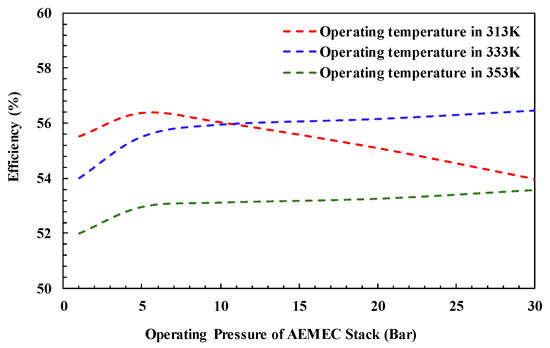 When the electrolyzer is operated at 333 K, the performance of the electrolyzer is improved; however, due to the increase in heater power being significant, the energy efficiency is reduced. As the hydrogen production pressure is increased, the high pressure of the electrolyte pump increases the overall heat transfer efficiency, and less power for the heater is needed to increase the temperature of the electrolyzer. The heater can be used to increase the temperature of the electrolyzer. Therefore, increasing the pressure of hydrogen production is conducive to improving overall energy efficiency. For a higher operating temperature, as in the case of 353 K in Figure 9, since the self-generated source caused by the electrochemical reaction is insufficient to maintain the electrolyzer operating temperature, more heater energy is required, and hence, the energy efficiency is lower than 333 K. The results reveal there is an optimum operating temperature of the electrolyzer with relation to the thermal equilibrium of the AEM water electrolysis system.