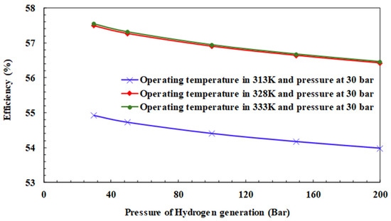 For example, for on site applications for boilers or industrial processes, the hydrogen pressure requirement is within 30 bar. Figure 9 shows the impact of a hydrogen production pressure of 1~30 bar on the energy efficiency under three operating temperatures of the electrolyzer. In the case of 313 K, increasing the hydrogen production pressure of the electrolyzer can reduce the power consumption of the compressor. However, raising the electrolyte pump pressure simultaneously increases the power consumption. Otherwise, as mentioned above, high hydrogen production pressure would also reduce the performance of the electrolyzer, i.e., increase the energy consumption of hydrogen production. As a result, for the electrolyzer operating at 313 K, the energy efficiency of the hydrogen production system decreases as the hydrogen pressure of the electrolyzer increases.