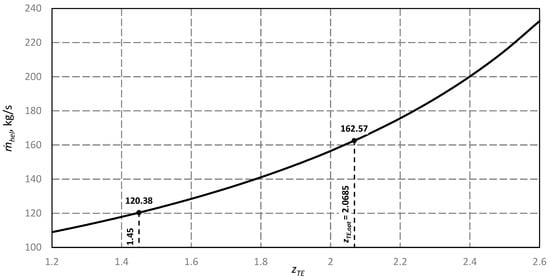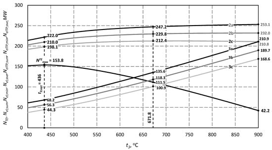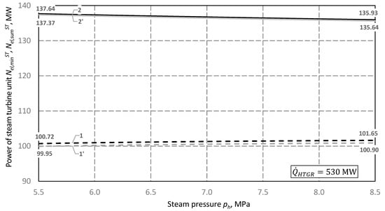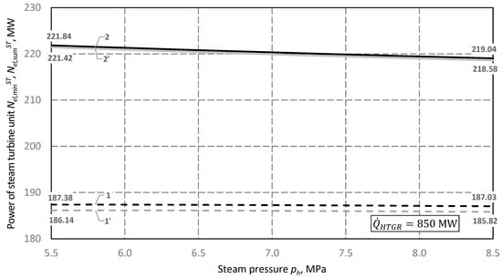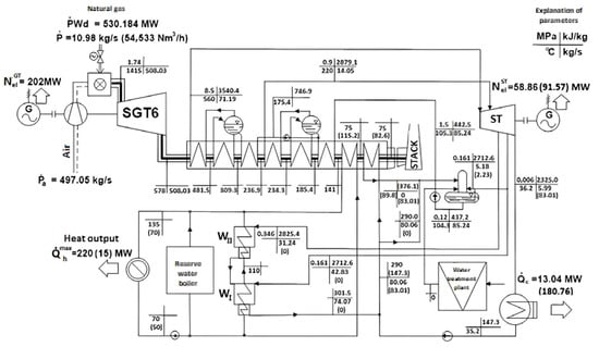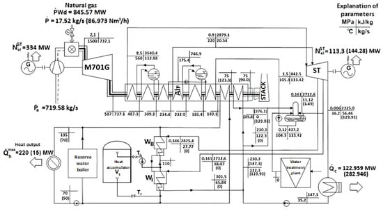 - the steam turbine power output during the non-heating season (summer: the power of the steam turbine then reaches its maximum value), i.e., when the CHP plant is operating exclusively to meet the demand for DHW preparation (the heat exchangers and are not used at that time; , and only the mains water heater in the HRSG is in operation with an output power of = 15 MW (Figure 5)):where: