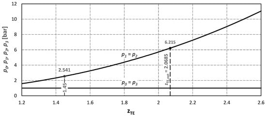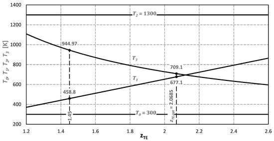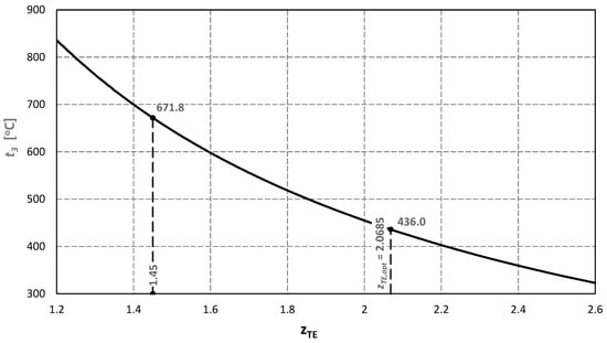 - The temperature of the helium downstream of the low-pressure part of the steam generator (which is also the temperature of the helium after the low-pressure economizer and, consequently, the temperature of the helium entering the mains water heater integrated into the HRSG) is calculated from the equation representing the energy balance of the high- and low-pressure parts:where is the specific enthalpy of feed water supplied to the HRSG.