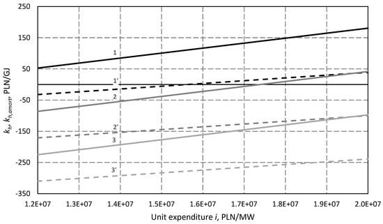 | Unit cost of heat generation kh,amort | PLN/GJ | 516.67 | 808.40 | ||