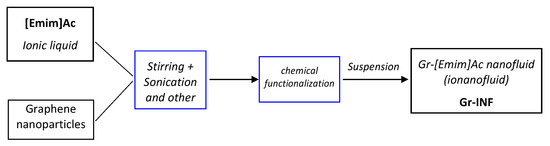 Water, 1-ethyl-3-methyl-3-methyl-3-methylimidazolium acetate (≥95% purity) or [Emim]Ac, supplied by IoLiTec (Heilbronn, Germany), and ionanofluid (INF) consisting of a 1% mass suspension of graphene nanoparticles in the above ionic liquid, hereafter referred to as Gr-INF, were used as working fluids. To prepare the ionanofluid, physical methods such as agitation and sonication mainly, as well as chemical methods such as covalent or non-covalent functionalization, have been used [44]. Figure 1 schematizes the ionanofluid production process.