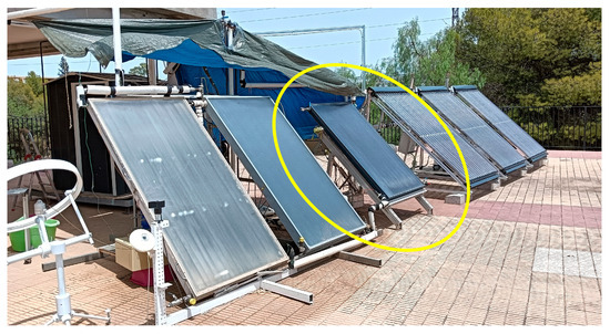 Experimental tests were carried out at the Solar Laboratory of the University of Murcia (Spain). The laboratory is equipped with different types of commercial solar collectors, as well as experimental ones, including a hybrid solar thermal-photovoltaic (PVT) collector of the Endef brand (Hybrid solar panel—Endef), in addition to appropriate measuring instrumentation. Figure 2 shows a current image of the plant, showing conventional solar thermal collectors (left), a PVT hybrid collector (in the center, inside the circle) and vacuum tubes (right). The Endef collector is of the riser header configuration [12] or parallel-riser type, in which the inlet (bottom) and outlet (top) of the collector are connected by a set of parallel tubes (risers) through which the heat transfer fluid flows [45].