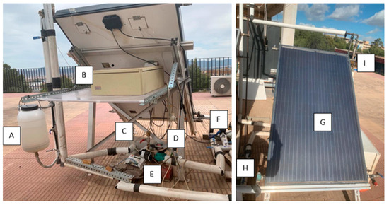 Experimental set of solar PVT panel. (A) Tank, (B) Data logger, (C) Heat exchanger, (D) Pump, (E) Photovoltaic regulator, (F) Flowmeter, (G) Solar panel, (H) Inlet temperature probe and (I) Outlet temperature probe.