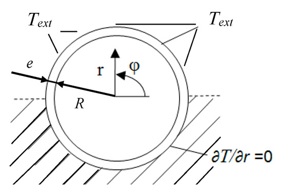 HEATT physical model. Cross section of the tube showing the cylindrical coordinates of the problem and the boundary conditions: upper half of its surface at Text temperature and lower half thermally insulated.