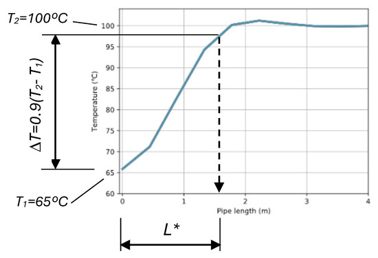 The so-called characteristic length, L*, is a hidden quantity, which means that it cannot be measured with standard meters, with different meanings depending on the process. To the one considered in this work, the characteristic length reveals the length needed for the potential heat transfer process to be completed [38,55,56,57], i.e., when the entire fluid reaches, or at least approaches, the external temperature. In this case, it has been measured as the length needed for the center of the fluid to reach 90% of the external surface temperature.