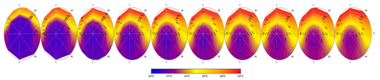 [Emim]Ac steady-state temperature maps of the tube cross sections at different lengths (L/10 to L) from the tube inlet. HEATT screenshot. The evolution of the fluid temperature along the tube can be seen with the color code.