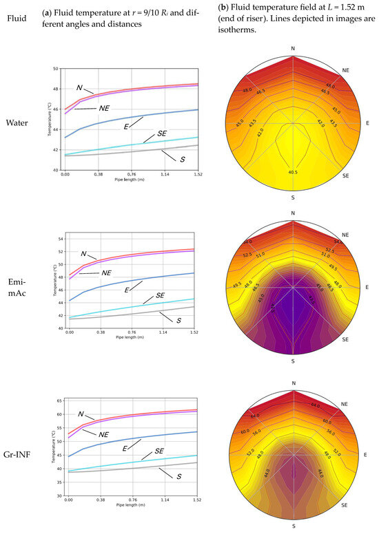 Figure 7 shows the results of the simulations of the three fluids of Table 4 inside the PVT collector. Column a shows the evolution of the fluid temperature along the tube for r = 9/10 Ri, with Ri being the inner radius of the tube, and different azimuthal angles, named with the acronym of the geographical orientation, i.e., N (north) is the highest point of the fluid, and its plane is the vertical top (φ = 90°); NE (north-east) corresponds to φ = 45°; E (east) is the horizontal plane (φ = 0°); SE (south-east) corresponds to φ = −45°; and finally, S (south) marks the lower vertical plane and the coldest points of the fluid (φ = 90°). Remember that the tube is subjected to a temperature higher than that of the fluid at the inlet in its upper half, while it is thermally insulated in its lower half (Figure 4), being symmetrical with respect to the N-S axis. For the simulations, the actual inlet temperature of the fluids in Table 4 has been taken, and the external temperature of the tube, Text, has been taken as a constant temperature higher than the fluid outlet temperature in each case, being 50.0 °C, 55.0 °C and 67.5 °C for water, IL and INF, respectively, according to measurements carried out on the collector absorber plate (Table 4).