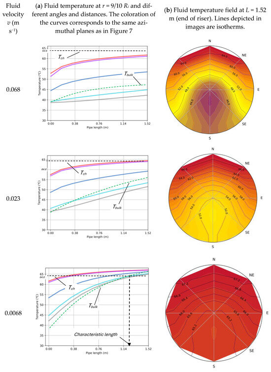 Figure 8 shows the simulations of the INF at three different velocities, the one that follows the flow criterion typically established for solar thermal collectors (v = 0.068 m s−1) and two slower velocities, v = 0.023 m s−1 and 0.0068 m s−1. The criterion commonly used for the determination of the characteristic length is that it can be considered reached when the bulk fluid temperature reaches 90% of the thermal gradient jump between the inlet temperature and that of the external condition [57]. In this case (Tin = 38.6 °C and Text = 67.5 °C), this value is 64.6 °C. The fluid bulk temperature, Tbulk, has been assessed as in Equation (5) [53]: