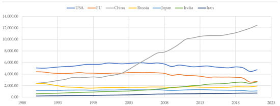 In this context, it is essential to analyze the current state of the climate crisis and assess where countries are heading. This article builds on the analysis by Portillo et al. (2022) [6]. Their research highlighted that nearly 50% of global GHG emissions are produced by China and the USA. However, when they examined the increase in emissions, they found that China, India, and Iran had seen the most significant growth in emissions. Iran, for instance, rose from the 23rd to the 7th largest emitter, with a 336% increase, while India’s emissions grew by 400%.