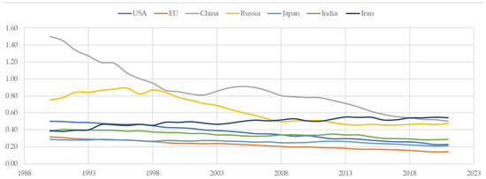 Regarding emissions intensity, conclusions are in the same line. All countries except Iran present a clearly decreasing trend. This may be related to the Environmental Kuznets Curve theory, which states that the emissions of CO2 follow an inverted U-shape with economic growth [52,85]. According to this theory, as economies develop and transition from industrial to post-industrial stages, emissions intensity tends to decrease. This is because developed economies, characterized by advanced technology and service-oriented industries, generally have lower emissions relative to their economic output. Their economic activities are less reliant on energy-intensive processes compared to developing economies, leading to improved efficiency and reduced emissions per unit of GDP.