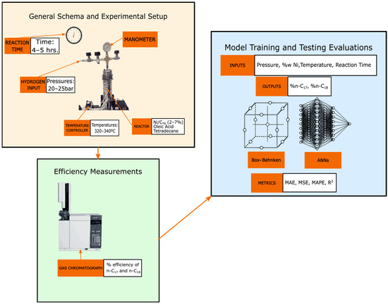 Our novel approach for integrating oleic acid into the hydrodeoxygenation process of Ni/CTR catalysts involves a multi-step methodology. We begin by establishing parameters for reaction time, hydrogen pressure, temperature, and % of metal in the catalyst by conducting several experiments to find different levels of production in alkanes. Then, to optimize the quantity of alkanes produced we run additional measurements to complete 345 tests, identifying alkane concentration using gas chromatography to build a dataset. Next, we develop Box–Behnken and ANN models and proceed to evaluate and compare them based on metrics such as Mean Absolute Error (MAE), Mean Square Error (MSE), Mean Absolute Percentage Error (MAPE), and R-Squared coefficient (R2). Finally, we find the optimal values for maximizing alkane production based on those models. The experimental design is illustrated in Figure 1 for reference.
