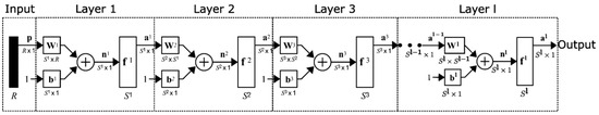 The ANN utilized in this work is a feedforward architecture commonly employed in regression models. The feedforward neural networks consist of an input layer, hidden layers, and an output layer, with consistent activation functions and the capability for multiple neurons in each layer [35,36]. An example structure with layers is shown in Figure 2, where is the input vector, is the weights matrix, is the bias vector, is the logits vector, is the activation function, is the output of the neuron, is the number of layers, is the number of neurons per layer, and is the number of inputs in that layer. Notice that , , , and .