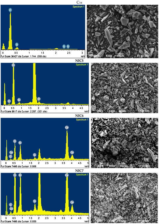 Using the EDS (Energy-Dispersive X-ray) technique, the elemental chemical composition of the Ni/CTR catalysts prepared with the Ni loads determined in the experimental design was determined. The compositions obtained with the EDS equipment were: 1.91%, 2.86%, 4.21%, 5.14%, 6.11%, and 7.19%, which show compliance with the theoretical quantities calculated and used for the preparation by the combination of pyrolysis and incipient wet impregnation methods. The slight variations observed between the experimental quantities obtained by EDS and the expected calculated values (2%, 3%, 4%, 5%, 6%, and 7%) can be attributed to the fact that EDS is a technique that reports the elemental composition of the Ni/CTR catalysts in a timely manner [39]. Figure 3 illustrates the morphology of CTR and the changes in surface characteristics due to the deposition of Ni at varying weight percentages on the catalytic support. The Ni is uniformly deposited on the carbon surface components. As the weight percentage of nickel increases, a greater surface area is covered by the metallic active phase.