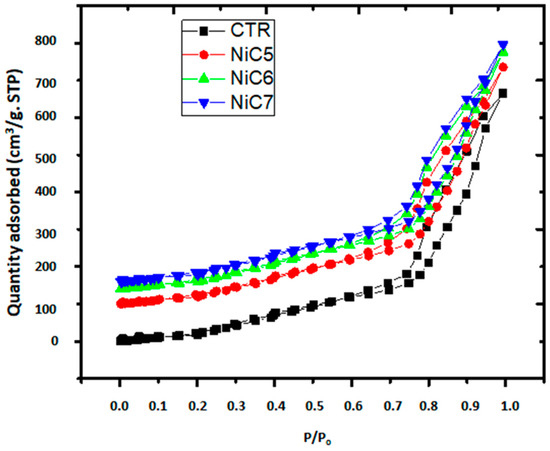 Figure 4 presents the nitrogen adsorption–desorption isotherms for CTR and the catalysts CTR, NiC5, NiC6, and NiC7. In all instances, the isotherms display a characteristic type IV shape along with a well-defined type H3 hysteresis loop, which is typical of mesoporous materials [42].