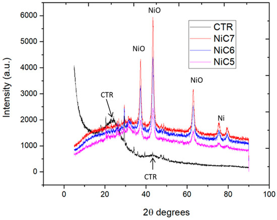 Figure 5 shows the XRD diffractograms of the three catalysts that presented yields of n-C17 and n-C18 alkanes closest to the optimization zone. In the three catalysts, peaks attributed to the presence of NiO located at 37, 43, and 63° can be observed [43,44], and the intensity of the peaks increases with the weight percentage of NiO [45]. The peaks corresponding to the CTR tire rubber carbon are not observed due to the overlap of the peaks of the NiO metallic active phase, however, a preparation of pure CTR was carried out and subjected to the same processes and preparation conditions as the catalysts with deposition of NiO, which serves as a witness that the CTR catalytic support is made up of disordered graphene characterized with the peak at 25.1°, as well as graphite according to the peak at 43.4° [2,46].