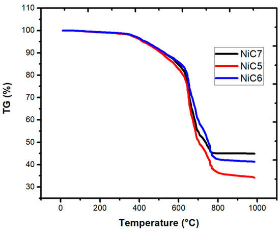 Figure 6 shows the thermogravimetric (TG) measurements of the catalysts that favored yields close to the optimization zone. For the three samples NiC5, NiC6, and NiC7, the first transition zone is in the range of 200 to 350 °C, with mass losses less than 5% attributed to the loss of –OH groups [9]. The most important transition zone and with the greatest mass elimination occurs from 360 to 760 °C, attributed to the elimination of the acid group (COOH) and other functional groups that begin to be lost at 500 °C [40]. The greatest mass loss was observed for the NiC5 catalyst, followed by NiC6, and NiC7 was the one with the least mass loss, which could be related to the strong metal–support interaction: the greater the amount of active metal phase, the lower the mass loss [41].