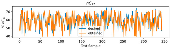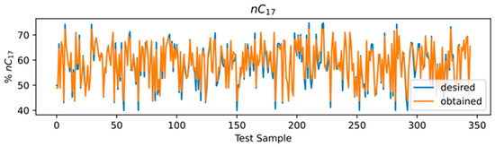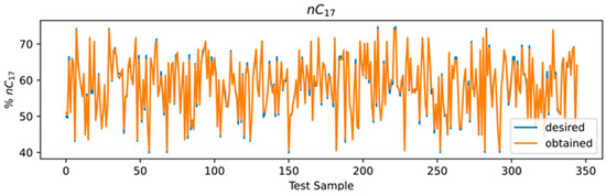 Figure 7 shows the n-C17 comparison between the target test in blue and the model response in orange for the trained Box–Behnken. The metrics that evaluate this comparison are shown in Table 6, including the Mean Absolute Error (MAE), Mean Square Error (MSE), Mean Absolute Percentage Error (MAPE) and R2.