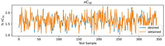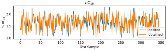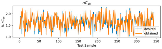 Similarly, Figure 8 shows the n-C18 comparison between the target test in blue and the best model response in orange for the trained Box–Behnken model. The metrics that evaluate this comparison are shown in Table 7, including the Mean Absolute Error (MAE), Mean Square Error (MSE), Mean Absolute Percentage Error (MAPE) and R2.