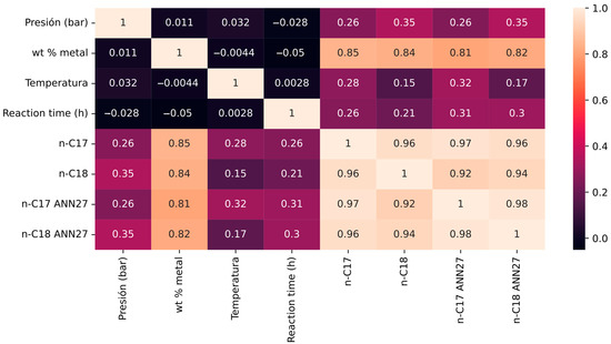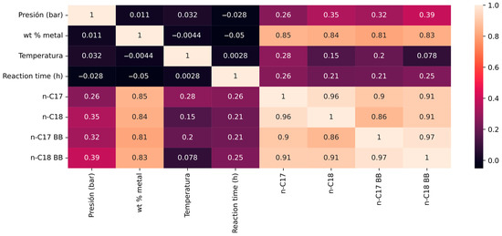 Moreover, we determined the Pearson correlation among the variables, the test data, and the Box–Behnken model response, as shown in Figure 9 and Table 9. The positive Pearson coefficients represent a direct correlation whereas the negative ones represent inverse correlation, expressed in ranges [0, 1]. The Pearson correlation is reliable when there is statistical significance, i.e., when the p-value is less than 5.0 × 10−1, or there is an error below 5%. Based on Table 9, The Box–Behnken (BB) model has a high Pearson correlation of 0.901432 with a statistical significance of 9.3 × 10−127 for predicting n-C17 alkanes. Similarly, the BB model has a high Pearson correlation of 0.860052 with statistical significance of 2.9 × 10−102 for predicting n-C18 alkanes. Additionally, all inputs contribute to the BB model for alkane prediction with different levels of correlation, but there is not enough statistical significance for supporting the contribution of temperature to the generation of n-C18 alkanes, since the p-value is 0.149284.