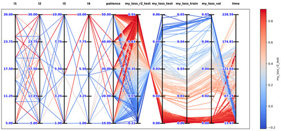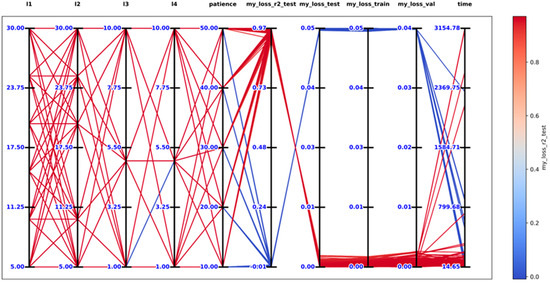 The parallel plot of the hyperparameter optimization with exhaustive search across the , , , , and with the configuration described in Section 2.5 for the training distribution with 27 samples for training and 345 for testing is shown Figure 10, obtaining the best result with , when , , , , and .