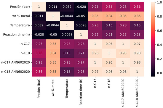 Additionally, we determined the Pearson correlation among the variables (Figure 17), the test data, and the ANN602020 model response. Based on Table 19, the ANN602020 model has a high Pearson correlation of 0.995199804 with a statistical significance of 0.0 for predicting n-C17 alkanes. Similarly, the ANN602020 model has a high Pearson correlation of 0.976071019 with a statistical significance of 2.2912 × 10−229 for predicting n-C18 alkanes. Additionally, all inputs contribute to the ANN602020 model for alkane prediction with different levels of correlation. Moreover, the ANN602020 model has the highest statistical significance for all the tested Pearson correlations. Table 20 shows the optimal configuration obtained for maximizing alkane production with pressure 25 bar, wt 7% metal, 340 °C of temperature, and 5 h of reaction time.