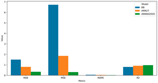 Comparison of metrics evaluation among BB, ANN27, and ANN602020 models.
