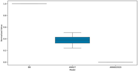 Despite the compelling visual evidence indicating that ANN602020 is the superior model, it is essential to normalize all metrics to a range of 0 to 1. This normalization allows for consistent scaling across all metrics, ensuring that they are directly comparable and enabling them to achieve their optimal value at 1 and worst value at 0. This normalization is particularly crucial since error-related metrics have varying scales and perform worse as their values increase, which is contrary to the behavior of the R2 metric. After standardizing the metrics, we used a boxplot, shown in Figure 19, to compare the models; once again the best model is ANN602020. Additionally, we performed an ANOVA test, as presented in Table 21, to showcase that there are significant differences among the models with statistical significance since F = 252.6423 and PR(>F) = 1.24 × 10−8.